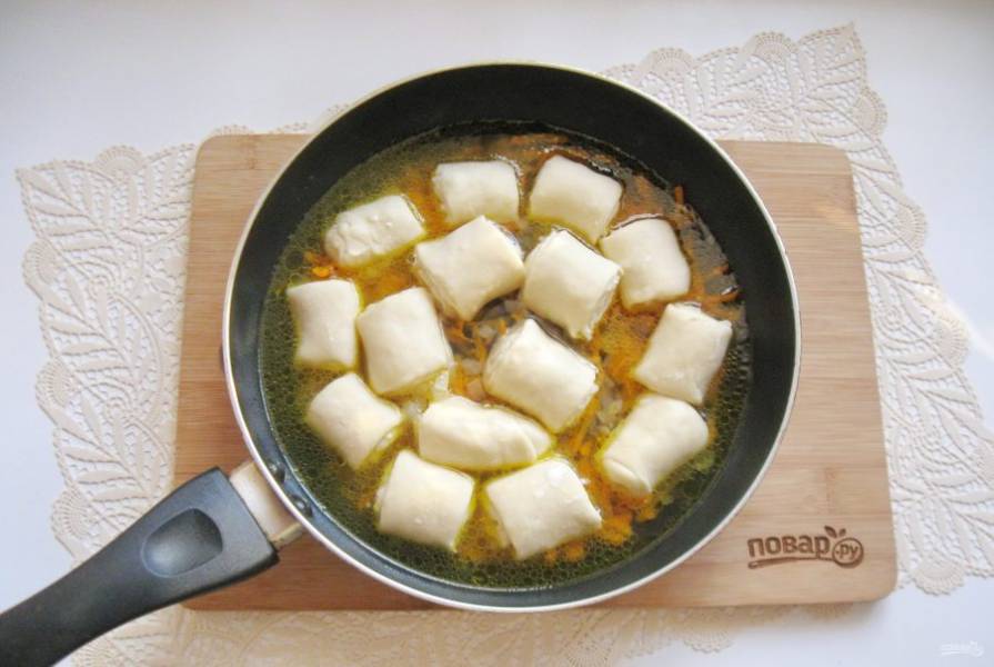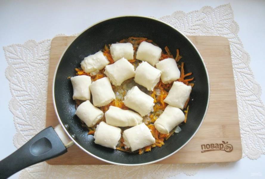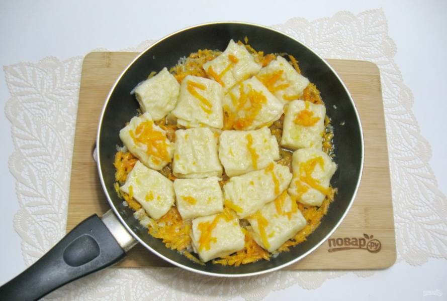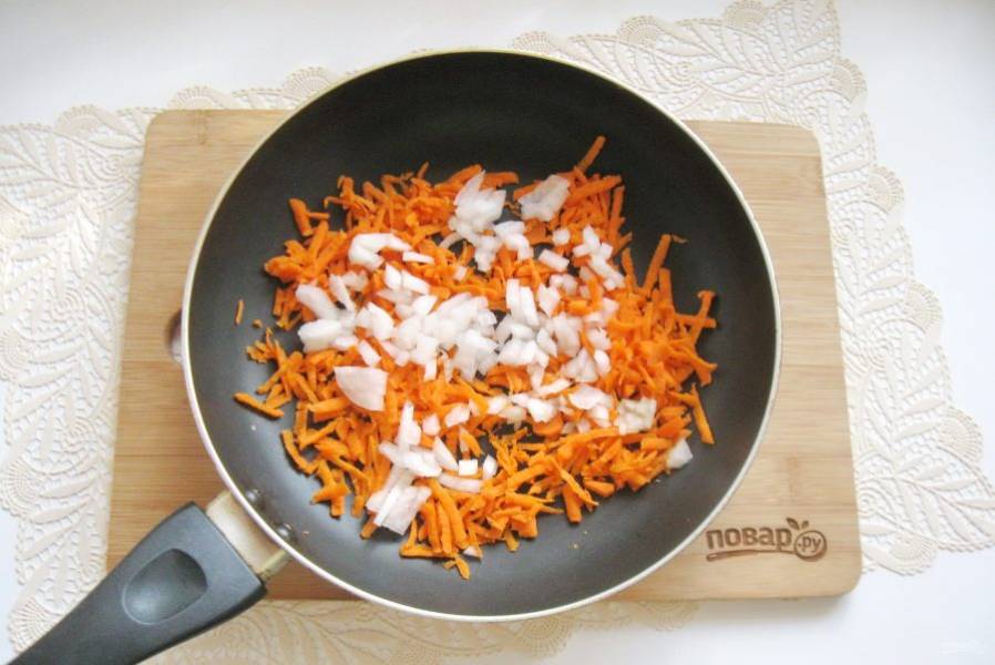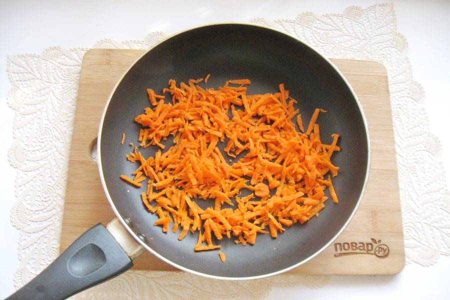 Морковь очистите, помойте и натрите на терке. Выложите в сковороду.