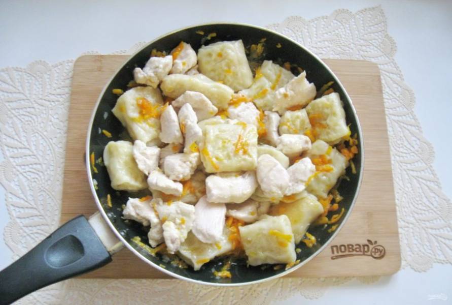 К рулетам в сковороду добавьте курицу и перемешайте.