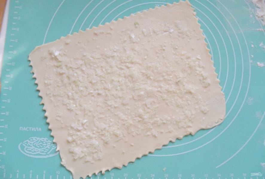 Сверните тесто с луком рулетом. У меня получилось два рулета.