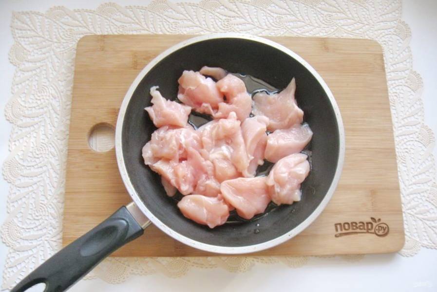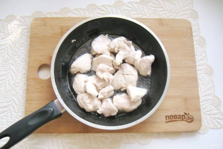Куриное филе помойте и нарежьте небольшими кусочками. Выложите в сковороду с подсолнечным маслом.
