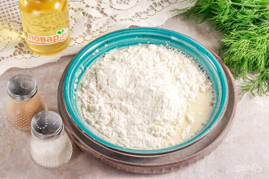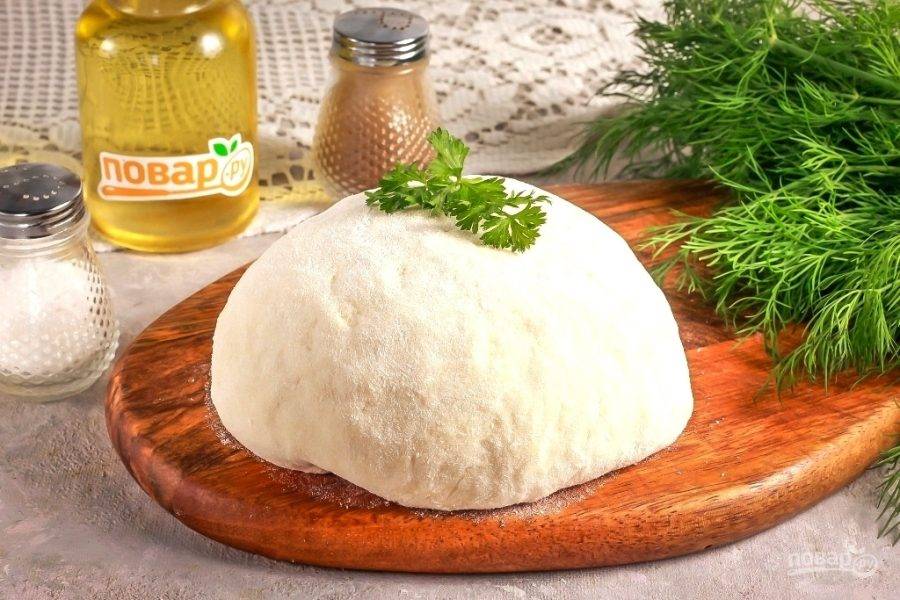 Всыпьте по частям просеянную муку, замешивая гладкое и эластичное тесто. После замеса накройте емкость полотенцем или пищевой пленкой, оставьте тесто на 15-20 минут для активации клейковины. После чего обомните его несколько раз и приступайте к приготовлению блюд из него.