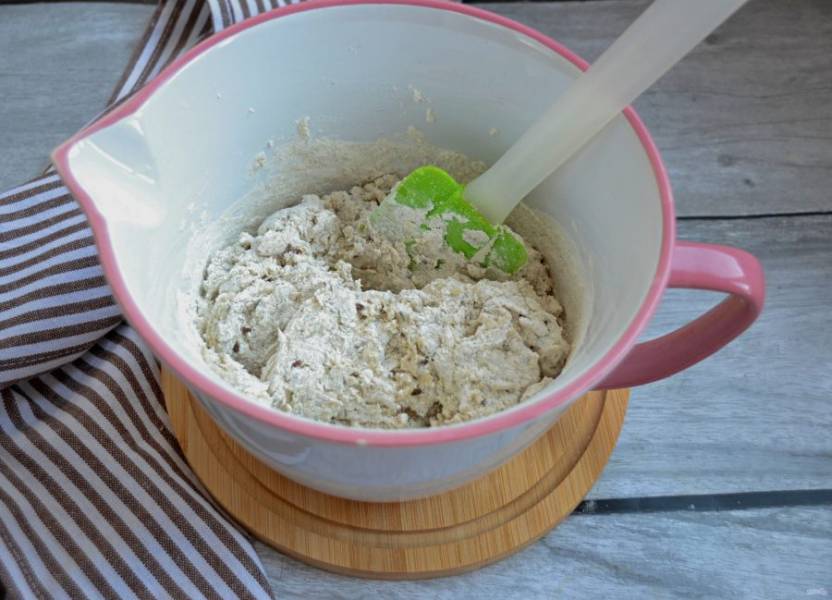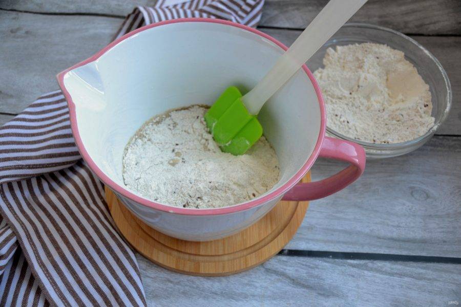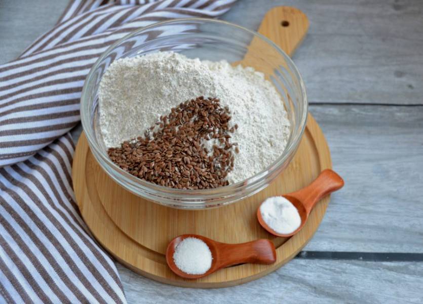 Смешайте два вида муки, семена льна, добавьте соду и разрыхлитель, смешайте.