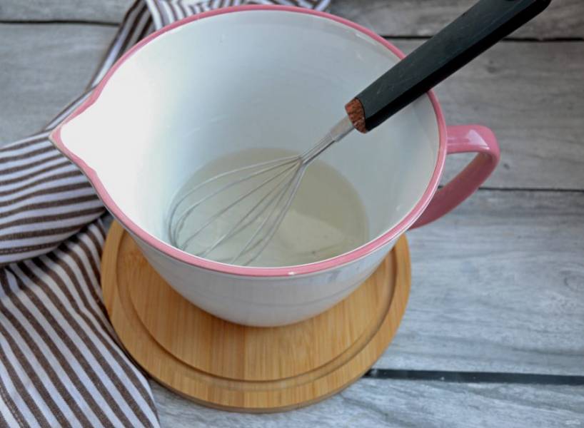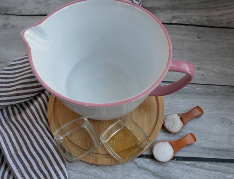 В миску для замешивания теста влейте воду, растительное масло, уксус, всыпьте соль и сахар.