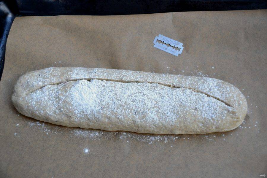 Переложите хлеб на лист для выпечки, слегка присыпьте мукой, сделайте надрез. Разогрейте духовку до 250 градусов в режиме «верх-низ».