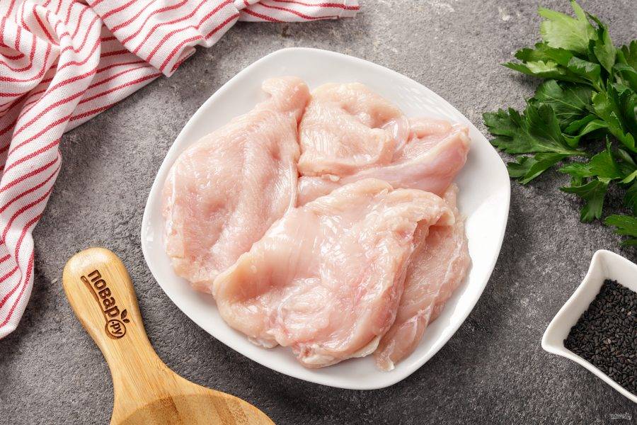 Подготовьте все ингредиенты по списку. Грудку предварительно промойте и обсушите. Сыр можно взять любой, который хорошо плавится.