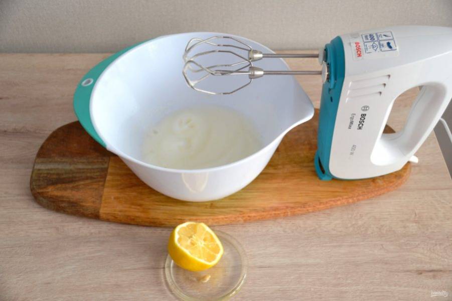 Влейте в чашу для взбивания яичные белки, взбейте их в пышную пену на высоких оборотах, добавьте чайную ложку лимонного сока.