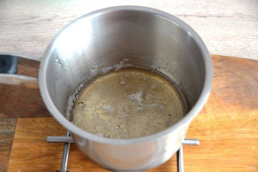 Всыпьте в сотейник сахар, влейте воду, нагревайте на среднем огне, не перемешивайте, только наклоняйте сотейник из стороны в сторону.