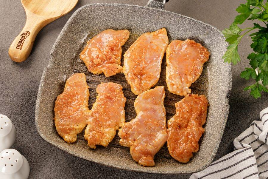 Для жарки советую использовать сковороду гриль, но подойдет и обычная. Прогрейте сковороду и сбрызните её маслом. Выложите филе на сковороду.