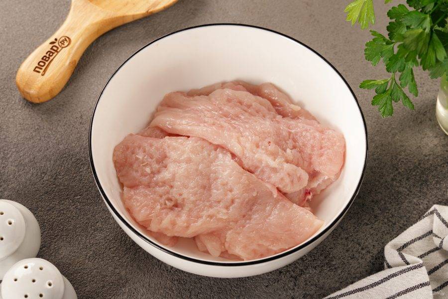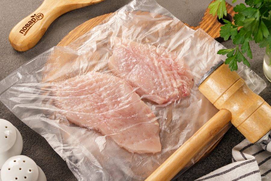 Затем каждый кусочек слегка отбейте с двух сторон при помощи кухонного молоточка, чтобы они по величине получились примерно одинаковые. Если не хотите брызг, можно накрыть филе пакетом или пищевой плёнкой.