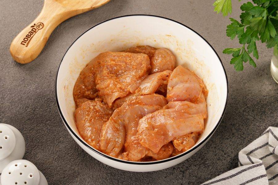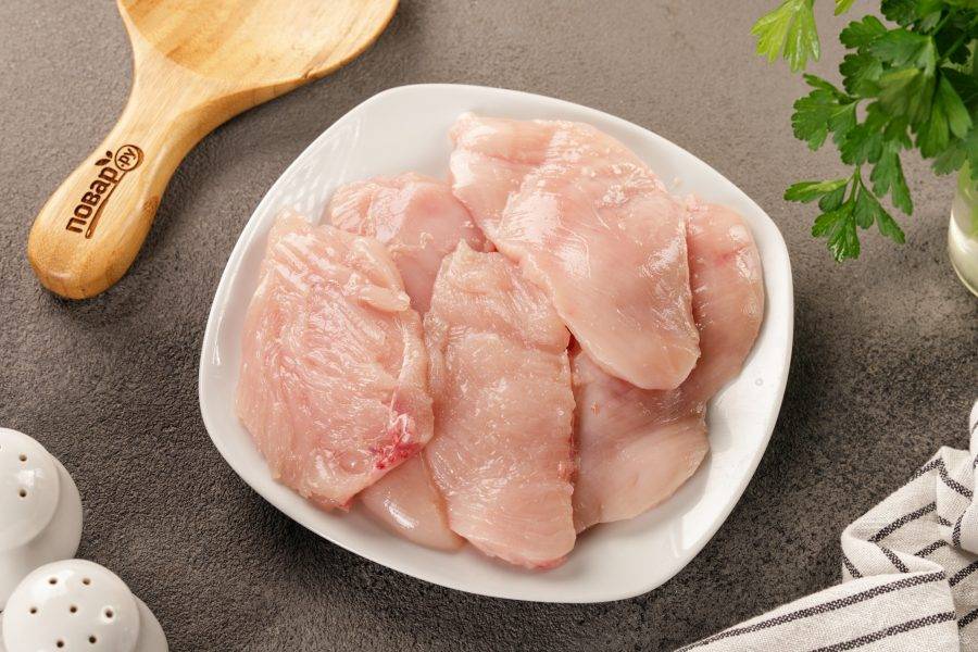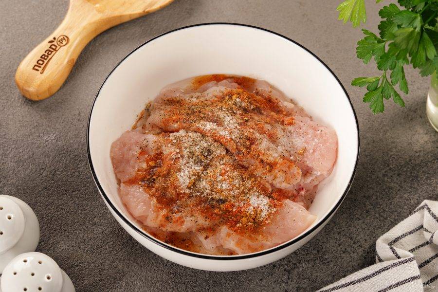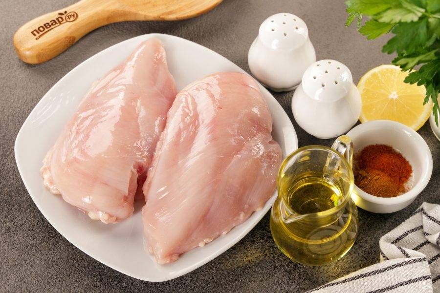 Подготовьте продукты. Бифштекс получится сочнее и вкуснее, если вы возьмете охлажденное мясо. Первым делом куриную грудку промойте и обсушите. Специи берите на свой вкус, я использую паприку и готовую смесь для курицы.