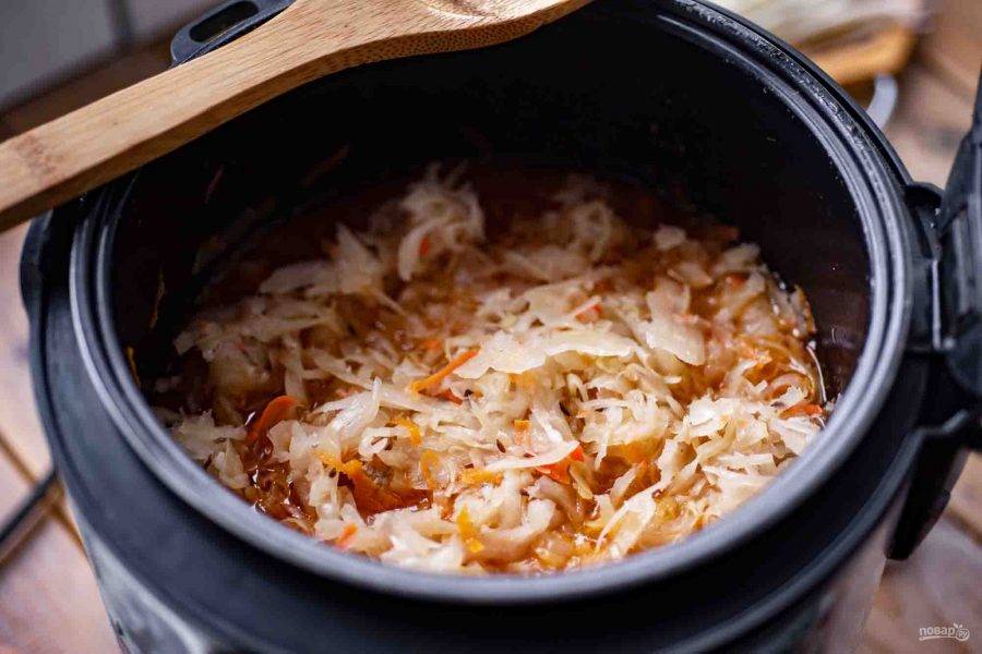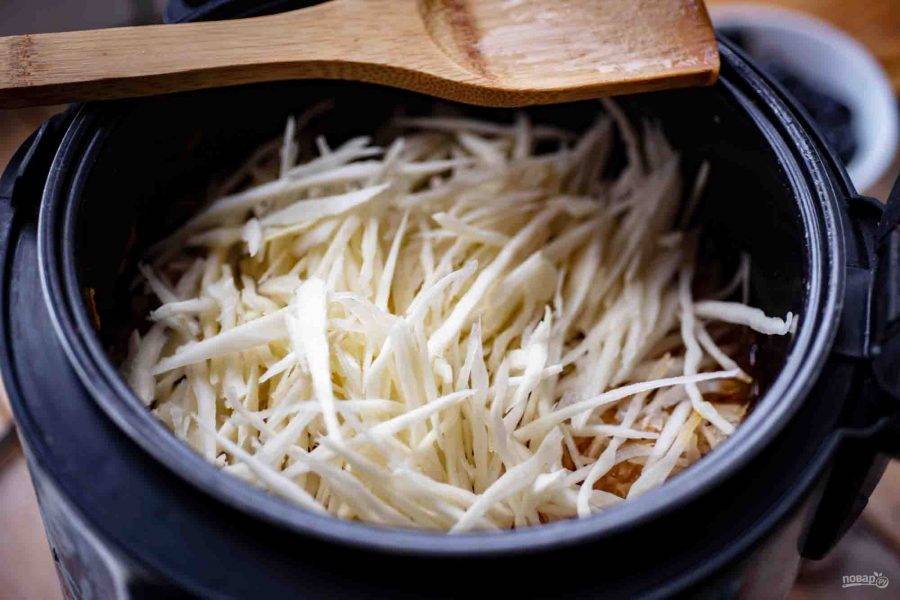 Поверх выложите нашинкованную капусту и запустите режим "Тушение" еще на 40 минут.