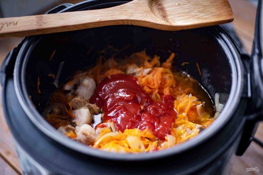 Затем залейте воду, добавьте томатный соус, соль, перец, перемешайте и запустите режим "Тушение" на 20 минут.