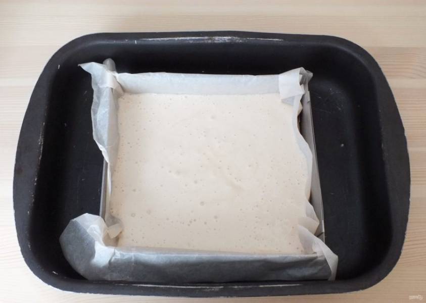 Возьмите для выпечки разъемную форму и выстелите ее пергаментом. Если у вас нет такой формы, воспользуйтесь обычной сковородой, но обязательно выстелите ее бумагой. Перелейте тесто, разровняйте лопаткой и поставьте выпекаться в разогретую духовку на 20 минут. Учитывайте особенности своей духовки!