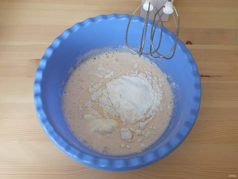 Добавьте к массе муку, разрыхлитель, майонез и еще раз взбейте. Включите духовку на 180 градусов.