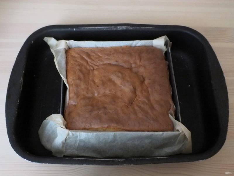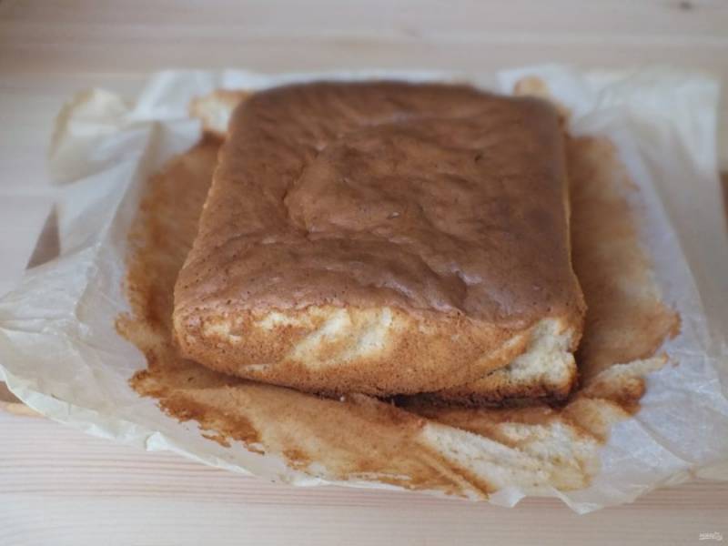 Готовый бисквит достаньте из духовки. При нажатии на верх изделия, оно должно пружинить. Вытащите из формы, но бумагу не снимайте. Охладите и только потом снимите пергамент.