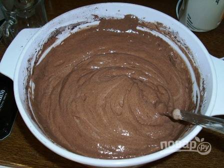 Добавляем к взбитым яйцам смесь муки с какао, а затем аккуратно снизу вверх перемешиваем ложкой или лопаткой.