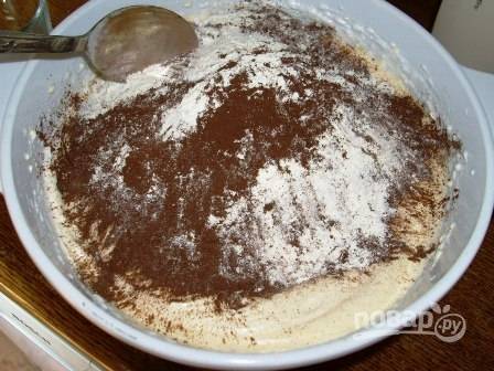 Смешиваем муку и какао. Лучше просеять все вместе через сито, так бисквит получится максимально пышный.