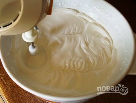 Взбиваем белки до появления пены, небольшими порциями добавляем сахар (обычный и ванильный). Взбиваем до устойчивых пиков.