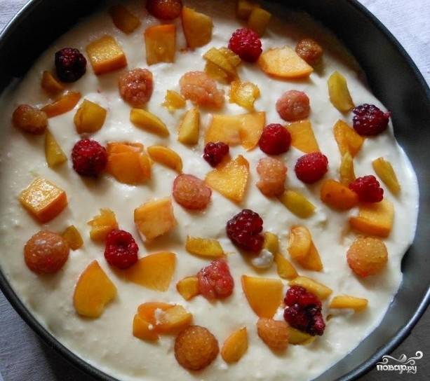 7. Теперь в форму заливаем треть крема, кладем на него фрукты и ягода, а затем наш готовый остывший бисквит. Сверху заливаем третью крема. Выкладываем еще часть фруктов.