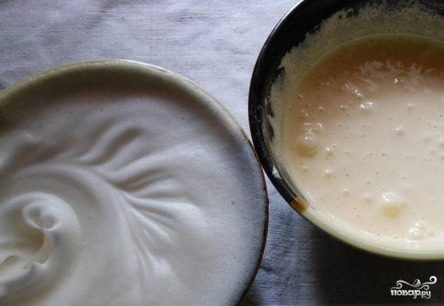 3. Затем соединяем желтки и белки и добавляем муку. Аккуратно все перемешиваем до однородного состояния.