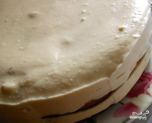 8. И снова заливаем кремом. Отправляем наш бисквитно-творожный торт в холодильник на 2 часа.