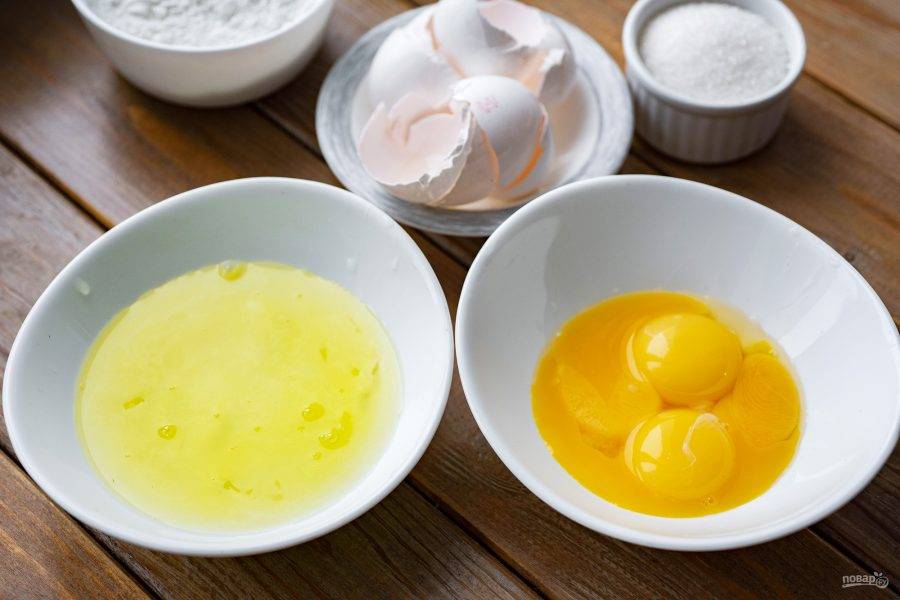 Аккуратно разделите яйца на желтки и белки по разным чистым и сухим мисочкам.