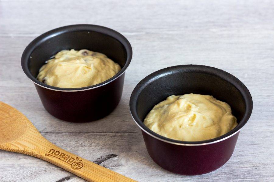 Формы для куличей смажьте растительным маслом и наполовину наполните тестом.