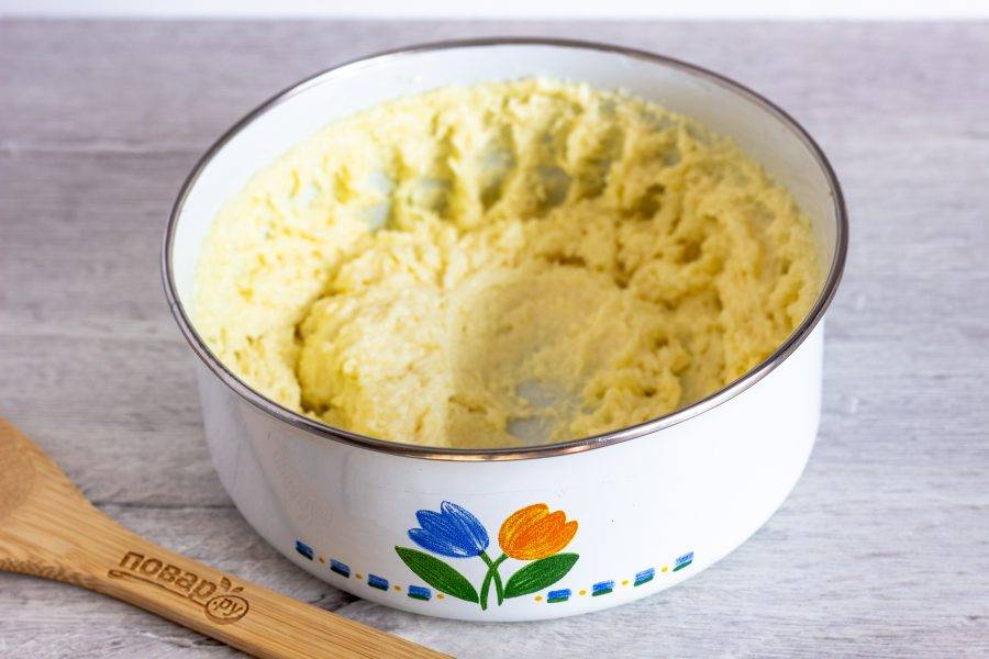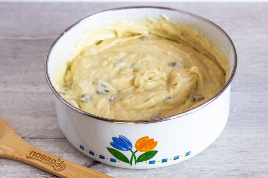 Муку просейте с разрыхлителем и введите в тесто. Размешайте лопаткой. Долго вымешивать не нужно.