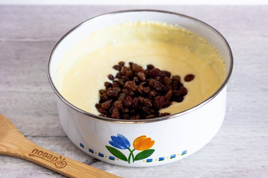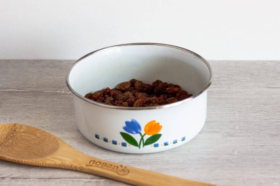 Изюм промойте, залейте горячей водой на 7-10 минут. Затем воду слейте и обсушите изюм бумажным полотенцем.