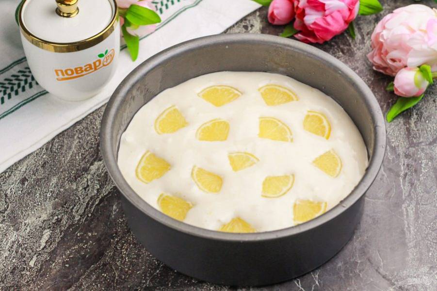 Смажьте форму растительным маслом и разогрейте духовку до 180 градусов. Выложите тесто в форму. Оставшуюся часть лимона нарежьте полукольцами, удаляя косточки. Главное — ломтики должны быть тонкими. Выложите нарезку сверху на тесто.