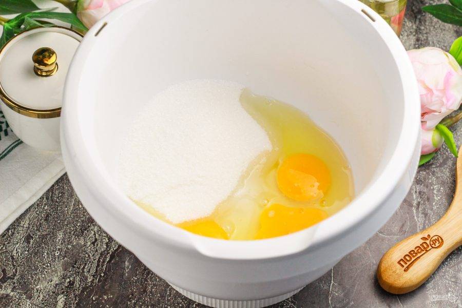 Куриные яйца разбейте в емкость миксера или кухонного комбайна. Всыпьте туда же сахарный песок и соль. Тщательно взбейте все содержимое емкости на высокой скорости техники примерно 4-5 минут в пышную пену.