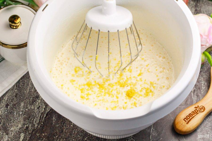 Ошпарьте лимон кипятком и вытрите насухо. Натрите цедру на терке с мелкими ячейками прямо в емкость. Выжмите сок из половины лимона, если он мелкий, и из четверти, если плод крупный. Всыпьте пшеничную муку по частям и тщательно перемешайте.