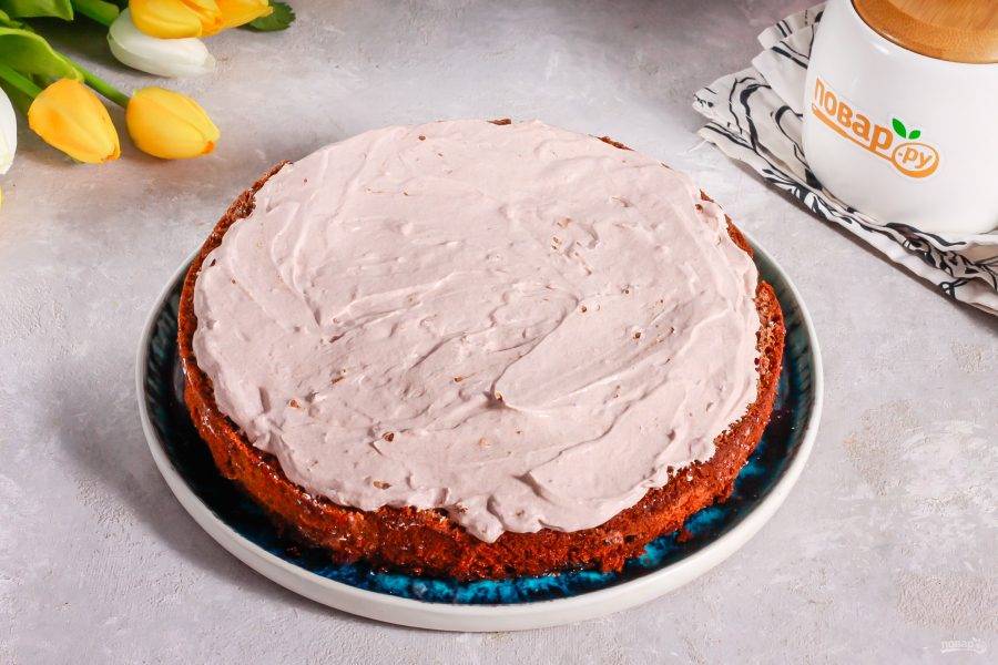 Выложите нижний корж на тарелку и смажьте половиной крема.