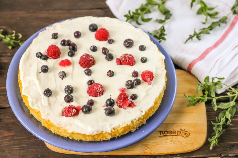 Накройте вторым коржом и выложите сметанный крем. По желанию торт можно обмазать полностью, можно оставить крем сверху. Украсьте десерт оставшимися ягодами и листочками свежей мяты, поместите в холодильник на 1 час для пропитывания.