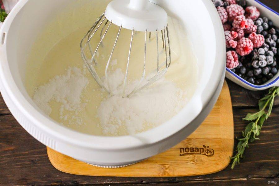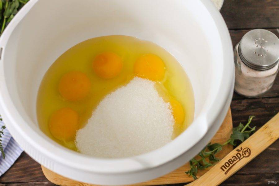 Вбейте куриные яйца в глубокую емкость, всыпьте 1 ст. сахарного песка и соль, взбейте в течение 3-5 минут на самой высокой скорости миксера или кухонного комбайна.