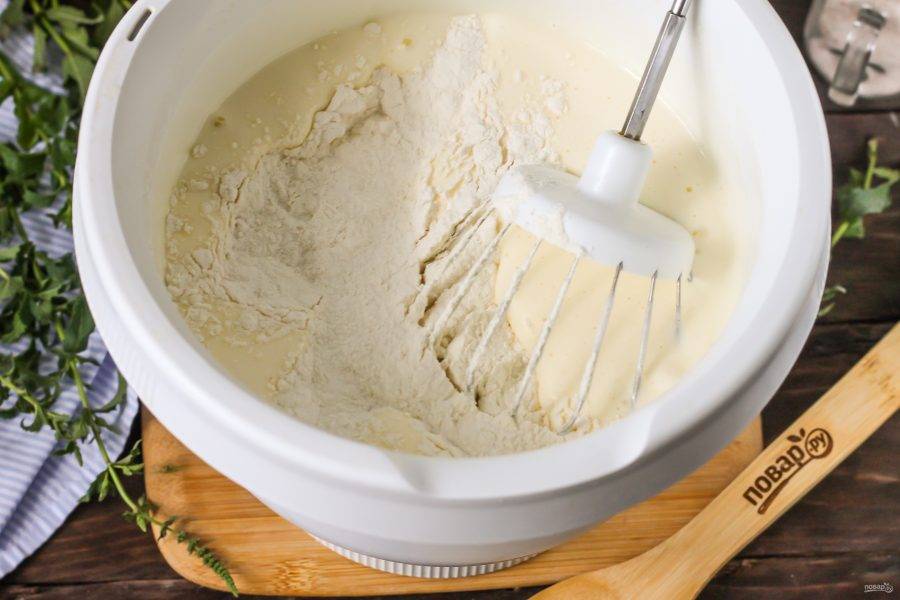 Всыпьте пшеничную муку и вмешайте ее силиконовой лопаткой в бисквитное тесто, чтобы не выпустить из него воздух.