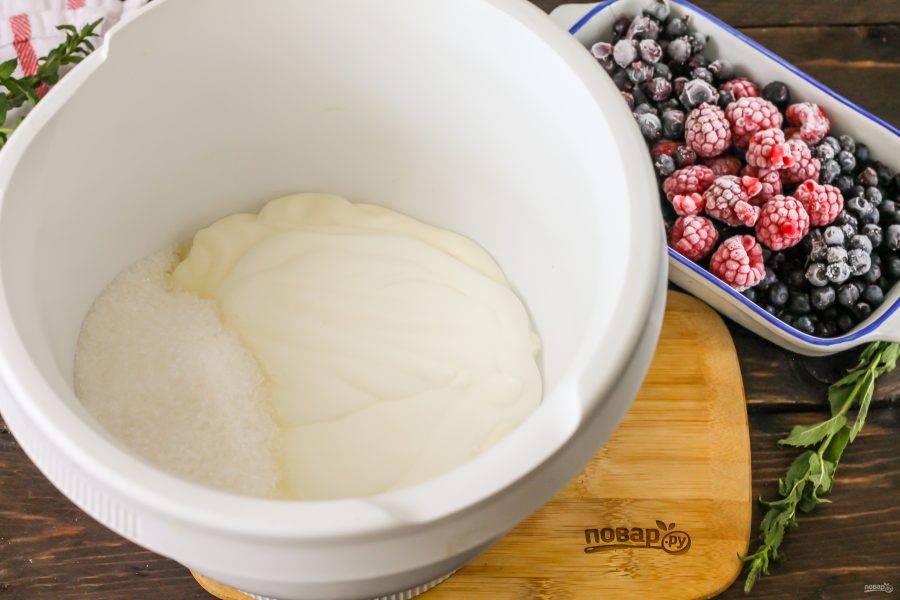 Сметану любой жирности выложите в чашу кухонного комбайна, всыпьте туда же 0,5 стакана сахарного песка. По желанию можно добавить ароматизатор. Взбейте сметану с сахаром примерно 3 минуты.