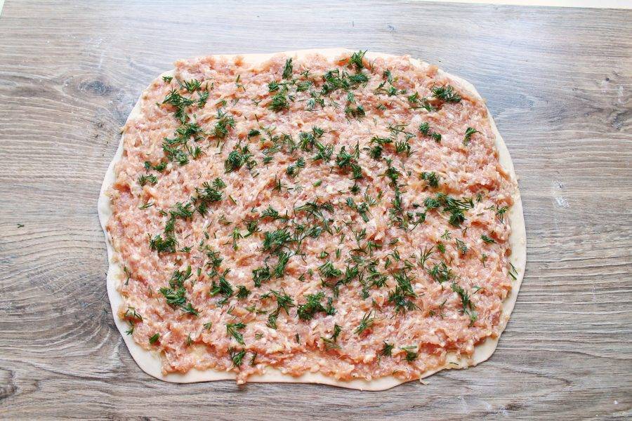 Укроп вымойте и обсушите, порежьте и посыпьте поверх фарша.