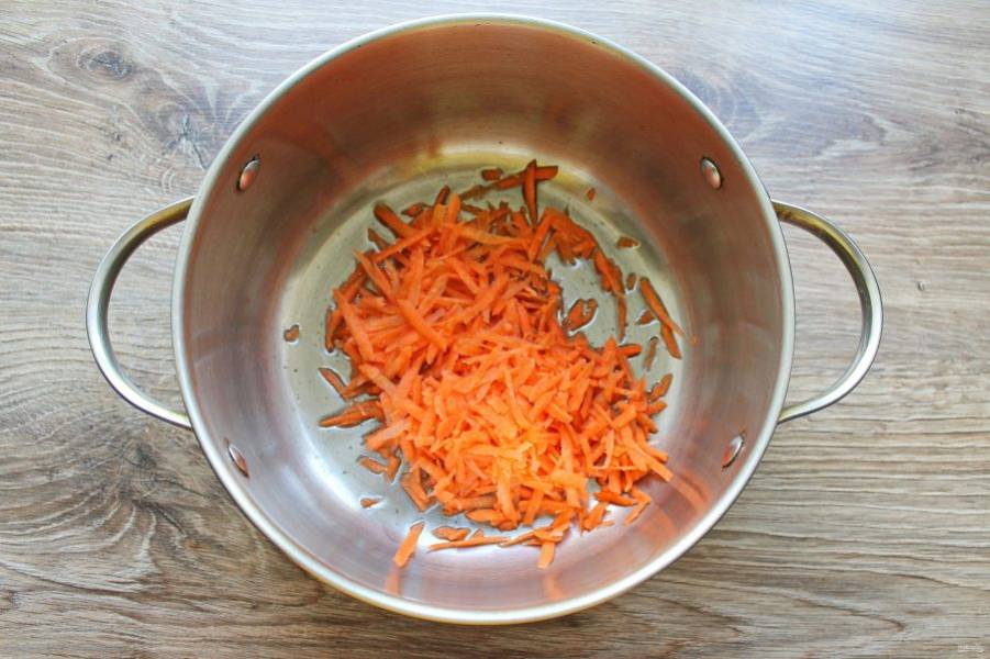 Морковь почистите, вымойте и натрите на крупной терке. В кастрюлю с толстым дном налейте масло, и выложите морковь.