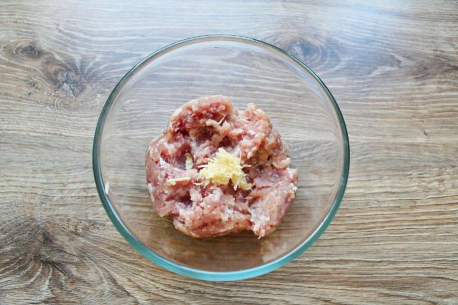 В миску выложите мясной фарш, добавьте перец, соль и тертый чеснок, перемешайте и отбейте.
