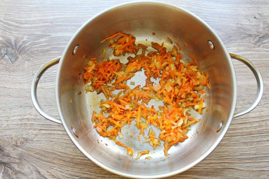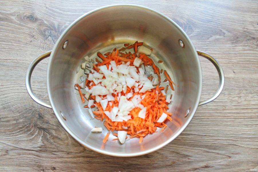 Лук почистите и мелко порежьте, добавьте его в кастрюлю с морковью.