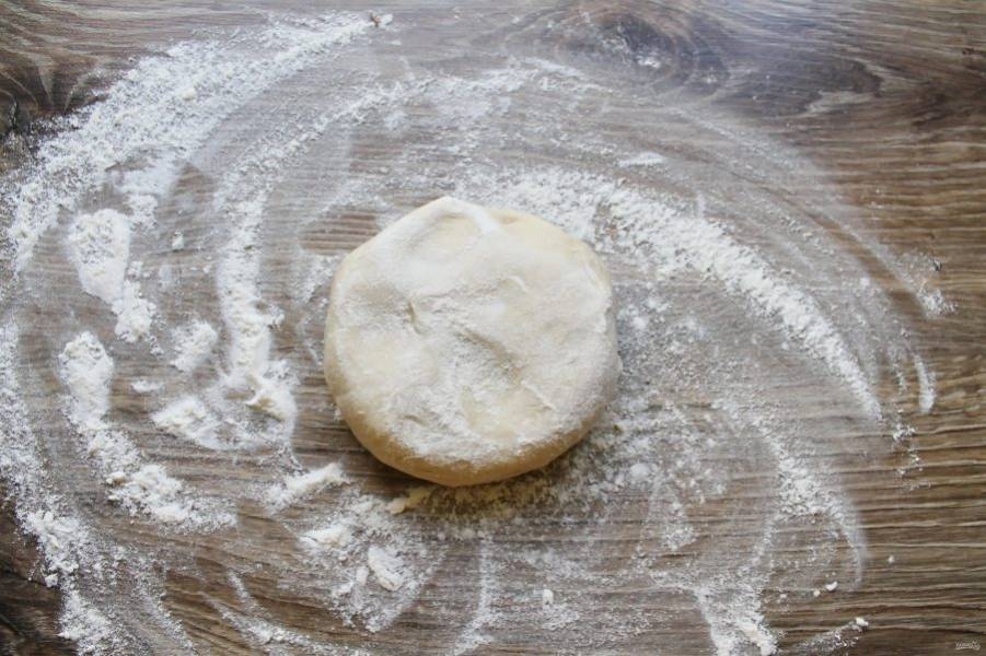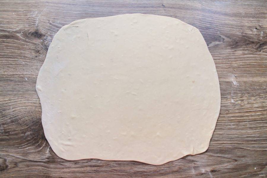 Стол посыпьте мукой. Выложите отдохнувшее тесто, раскатайте в тонкий пласт.