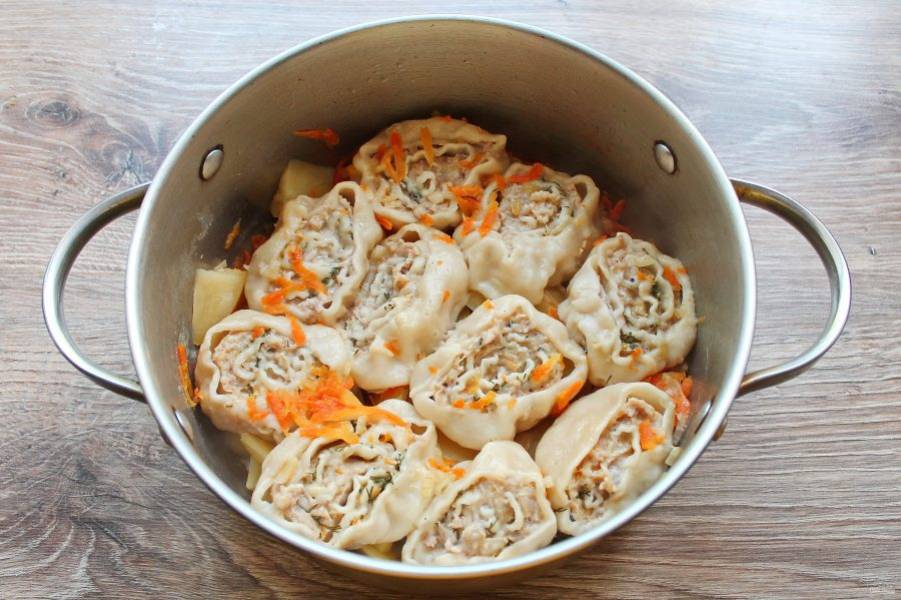 Влейте 1.5 стакана кипятка и поставьте на средний огонь. Доведите до кипения и убавьте огонь. Готовьте на медленном огне в течение 30-40 минут до готовности овощей и рулетиков.