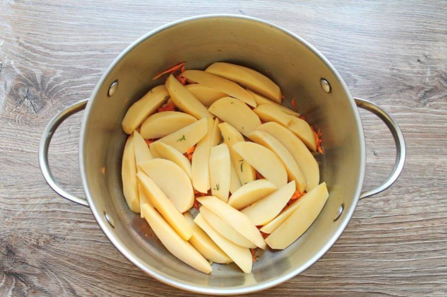 Картофель очистите, вымойте и порежьте дольками. Выложите картофель на обжаренные овощи, посолите.