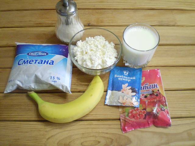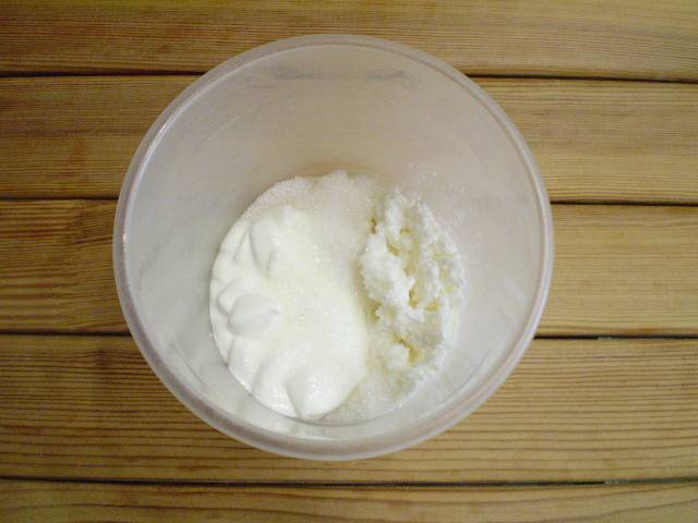 Соедините сметану с творогом и сахаром. С помощью блендера сделайте однородной массу.