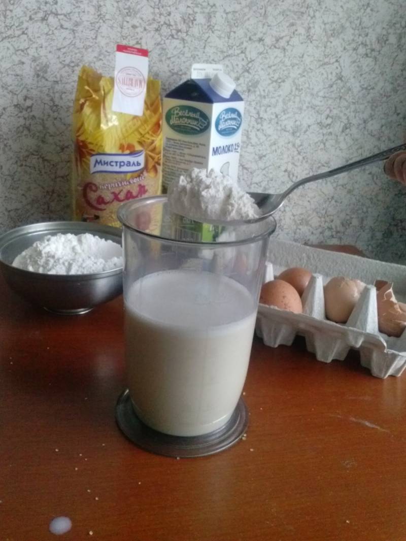 Заливая двумя стаканами молока. Блинчики готовлю часто, поэтому делаю все на глаз :)