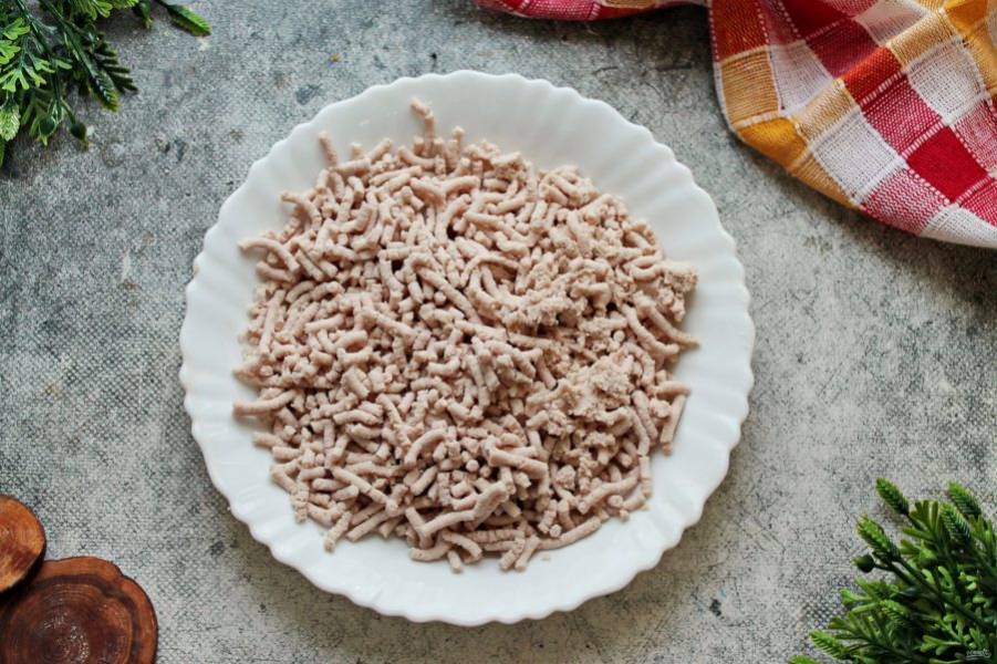 Порежьте остывшее мясо на куски и пропустите через мясорубку.