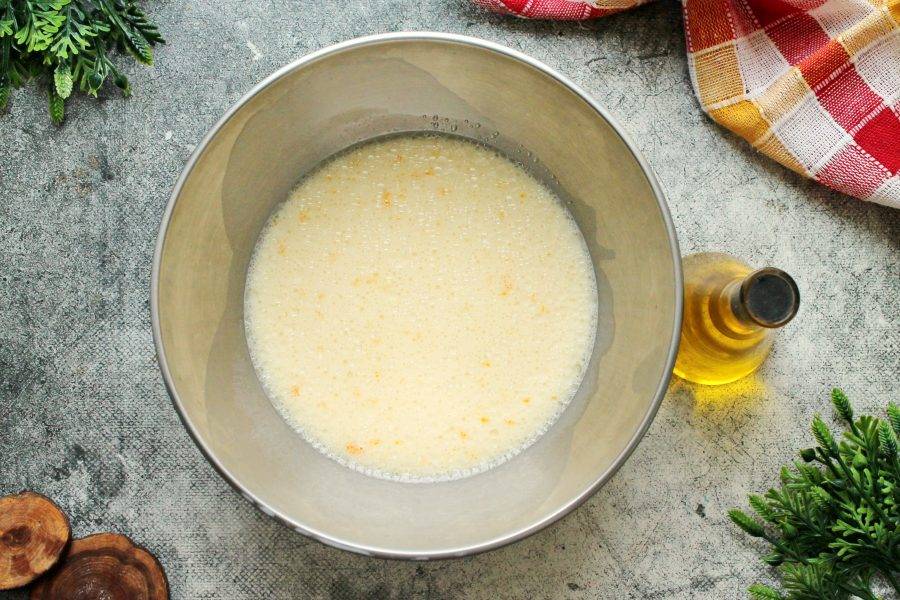 Пшеничную муку соедините с разрыхлителем и перемешайте венчиком. Просейте муку в молочную массу порциями, каждый раз, хорошо перемешивая до однородности. Дайте постоять тесту 10-15 минут.