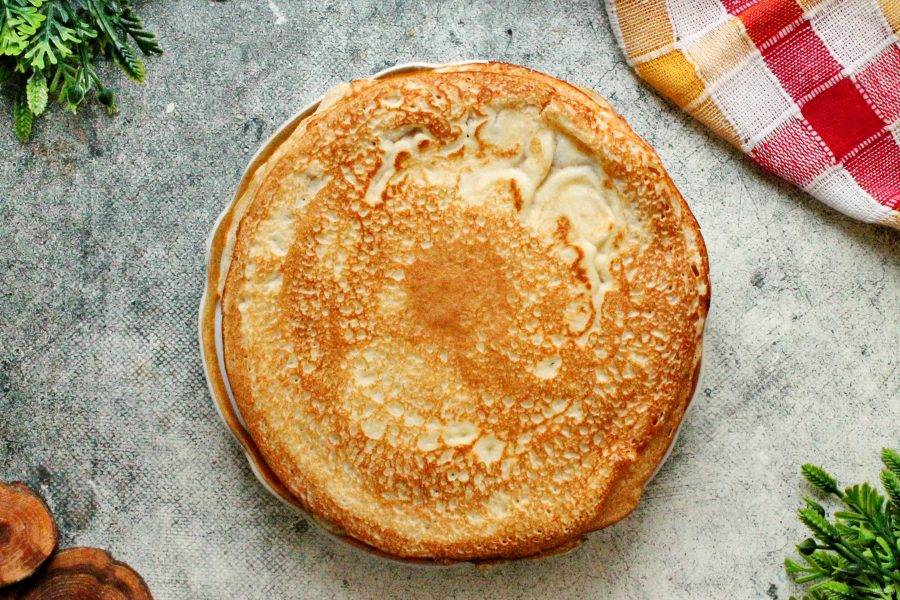 Сковороду смажьте растительным маслом и разогрейте на среднем огне. Влейте в сковороду часть теста и испеките блин с двух сторон до румяной корочки. Снимите блин на тарелку. Пеките блины, пока не закончится тесто.