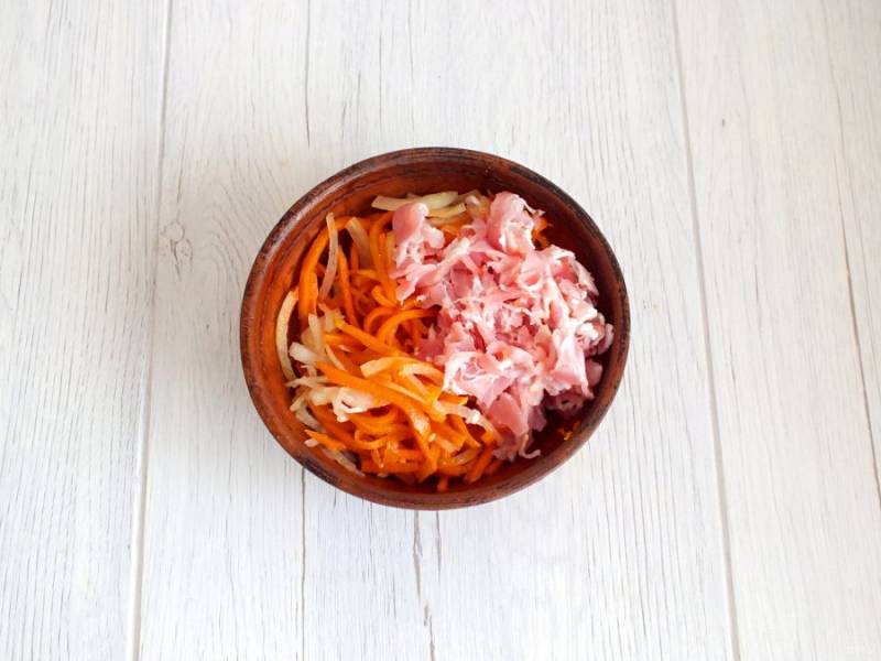 Соломкой нарежьте бекон, переложите к маринованному луку. Добавьте морковь по-корейски. Заправьте сметаной. Перемешайте.
